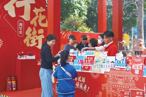 廣東農(nóng)墾下屬燕塘乳業(yè)的展位上,工作人員忙碌著,將各類奶產(chǎn)品交到消費者手中。一旁的互動墻上展示著燕塘乳業(yè)的故事、廣州花市的記憶和新春寄語。燕塘乳業(yè)的產(chǎn)品還換上了“馬年新衣”,包裝上印著花街門樓牌坊、節(jié)日焰火、聯(lián)名百年西湖花市非遺標志,還有“掂過碌蔗”“家肥屋潤”“撈乜都掂”“豬籠入水”等吉祥俚語,讓奶產(chǎn)品成為承載年味的“文化名片”。市民購買“新春限定版”牛奶,也將美好寓意一同納入行囊。