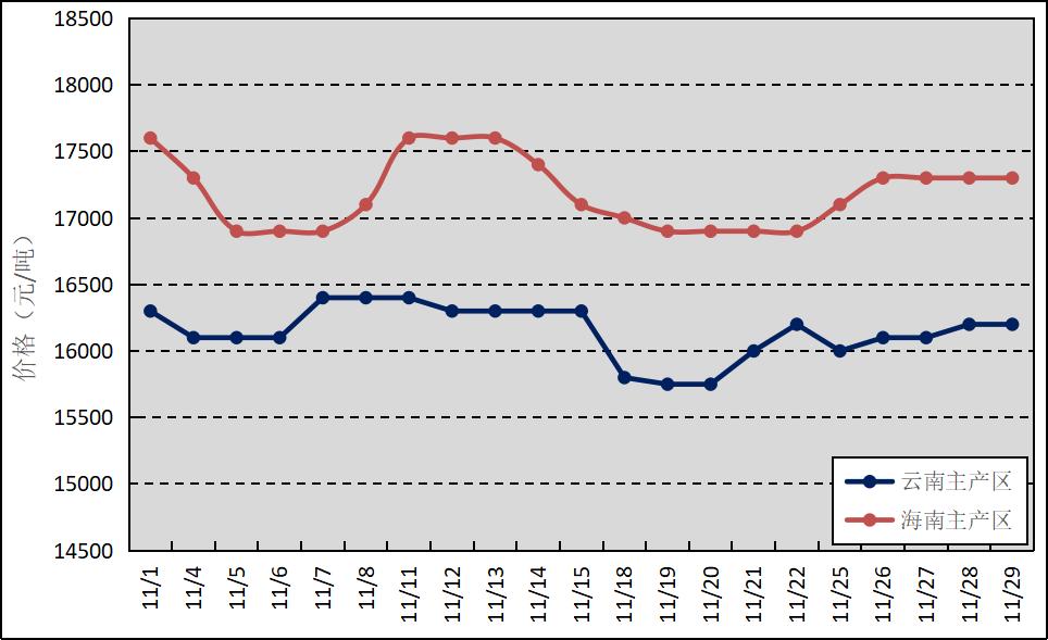 國(guó)內(nèi)主產(chǎn)區(qū):11月,云南大部分產(chǎn)區(qū)月底停割,海南產(chǎn)區(qū)正常開(kāi)展割膠。云南、海南鮮膠乳(折干膠)月均價(jià)格分別為16148元/噸、17186元/噸,環(huán)比下跌496元/噸、1464元/噸。