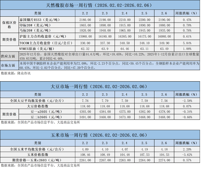 天然橡膠、大豆、玉米市場(chǎng)一周行情(2026.02.02-02.06)