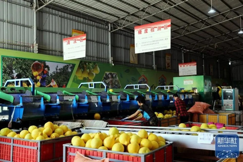 分揀與加工環(huán)節(jié)的突破,更讓沙田柚價值鏈大幅延伸。在松山鎮(zhèn),容縣田柚甄源農(nóng)業(yè)發(fā)展有限公司投資1200萬元建成廣西最大的沙田柚分揀中心,通過無損檢測生產(chǎn)線,沙田柚可實現(xiàn)清洗、風干、農(nóng)殘檢測、糖度檢測等一條龍“體檢”,自動分為A、B、C等級?!肮酉聵涞仡^價每斤4元左右,但經(jīng)過檢測后的A級果能賣到每斤8元或以上?!惫矩撠熑笋R飛燕說,“通過品質(zhì)分級,實現(xiàn)了市場分級?!爆F(xiàn)代化分揀技術(shù)的運用,還幫助容縣沙田柚成功獲得供深及供港基地認證,進入高端市場。