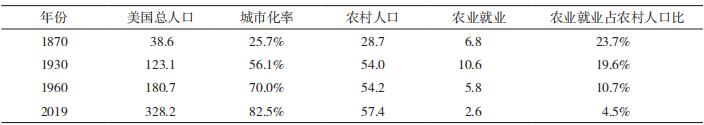 數(shù)據(jù)來源:美國(guó)人口數(shù)、城市化率數(shù)據(jù)來自美國(guó)勞動(dòng)統(tǒng)計(jì)(https://www.bls.gov/),1960年以前農(nóng)業(yè)就業(yè)數(shù)據(jù)來自LaborForceandEmployment,1800—1960(http://www.nber.org/books/brad66-1);2019農(nóng)業(yè)就業(yè)數(shù)據(jù)來自美國(guó)農(nóng)業(yè)部經(jīng)濟(jì)研究局(https://www.ers.usda.gov/data-products/chart-gallery/gallery/chart-detail/?chartId=58282)