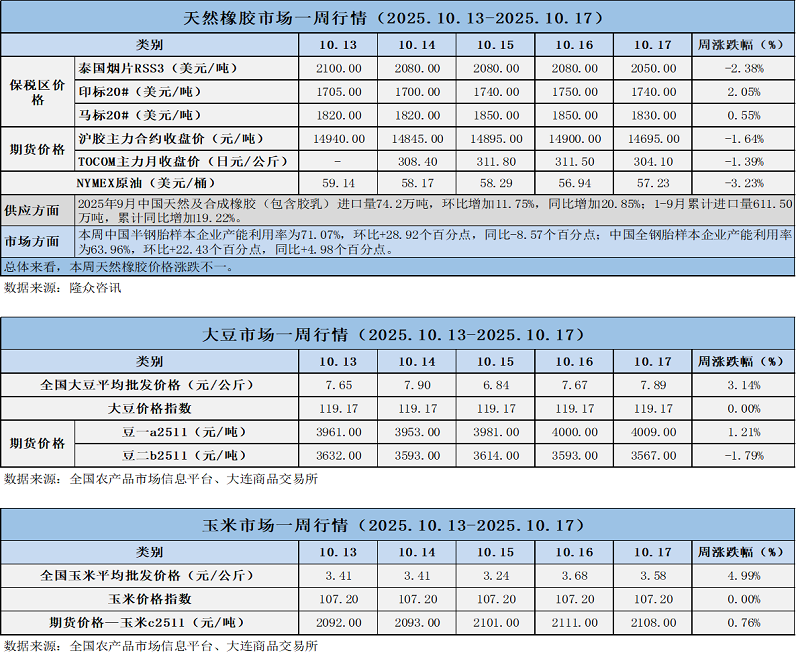 天然橡膠、大豆、玉米市場(chǎng)一周行情(2025.10.13-10.17)