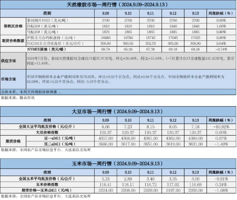 天然橡膠、大豆、玉米市場一周行情(2024.09.09-09.13)