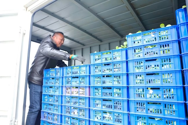 溫室內(nèi)暖意融融,一排排育苗穴盤整齊排列,嫩綠的白菜苗株型健碩、葉片舒展,在精細(xì)化管護(hù)下盡顯生機(jī)。工作人員們分工協(xié)作、忙而有序,熟練進(jìn)行拔苗、分揀、打包、裝車等作業(yè),動(dòng)作連貫高效,新鮮的白菜苗被整齊裝箱,即將運(yùn)往周邊種植基地,現(xiàn)場一派繁忙的出貨景象。