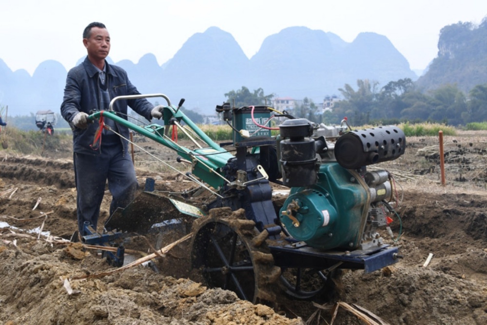 村民在駕駛農機給新種植的甘蔗覆土蓋膜