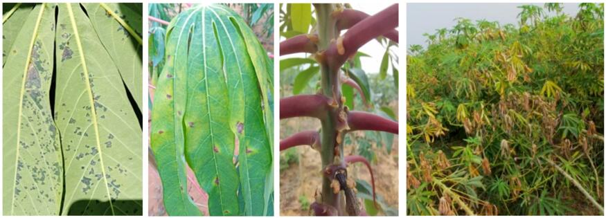由木薯細(xì)菌性萎蔫病引起的木薯葉片角斑、莖稈溢菌和植株枯萎癥狀