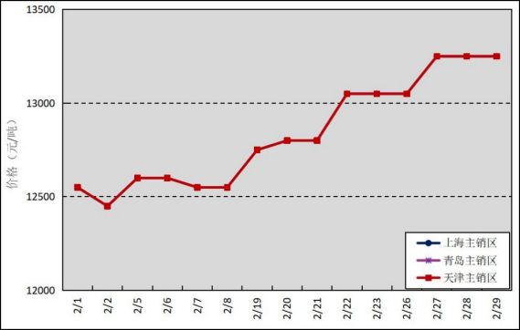 國內(nèi)主銷區(qū):2月,國產(chǎn)全乳標(biāo)準(zhǔn)膠上海市場平均價格12837元/噸,環(huán)比上漲21元/噸,最高價為13250元/噸,最低價為12450元/噸;青島市場平均價格12837元/噸,環(huán)比上漲21元/噸,最高價為13250元/噸,最低價為12450元/噸;天津市場平均價格12837元/噸,環(huán)比上漲21元/噸,最高價為13250元/噸,最低價為12450元/噸。