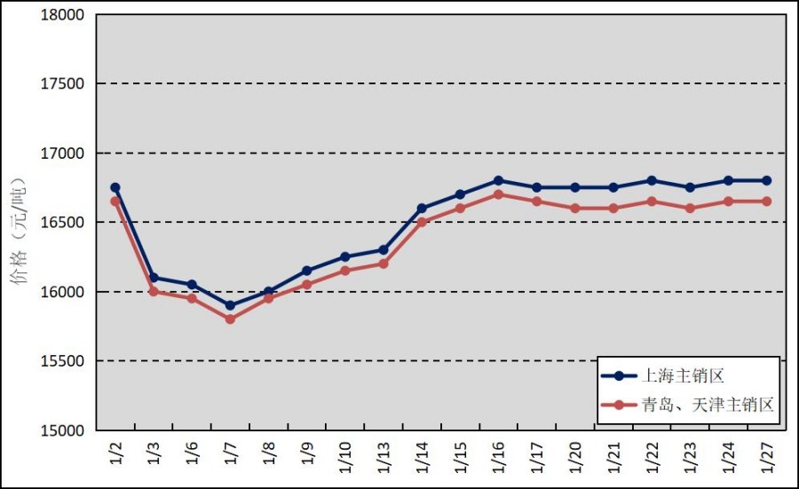 國(guó)內(nèi)主銷區(qū):1月,國(guó)產(chǎn)全乳標(biāo)準(zhǔn)膠上海市場(chǎng)平均價(jià)格16500元/噸,環(huán)比下跌736元/噸,最高價(jià)為16800元/噸,最低價(jià)為15900元/噸;青島市場(chǎng)和天津市場(chǎng)平均價(jià)格16386元/噸,環(huán)比下跌764元/噸,最高價(jià)為16700元/噸,最低價(jià)為15800元/噸。