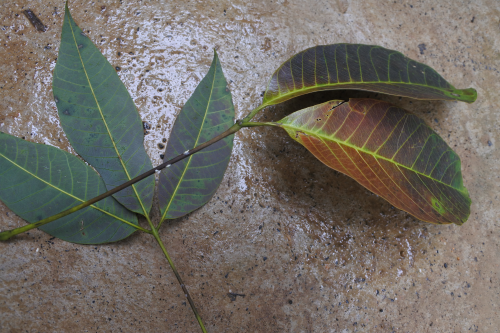 季風(fēng)性落葉病可危害橡膠樹葉片、嫩枝和膠果。嫩葉感病初期呈暗綠色水漬狀病斑,隨后變黑,凋萎脫落,新落的病葉一般葉色濃綠新鮮、葉面無其他異?,F(xiàn)象,若將葉柄剖開,可見髓部變?yōu)楹诤稚?;老葉的典型癥狀一般是葉柄基部先感病,初期呈水漬狀黑色條斑,病部溢出1-2滴凝膠,凝膠初為白色,后變黑。嚴(yán)重發(fā)生時(shí),病斑在葉柄上擴(kuò)展,整個(gè)葉片連同葉柄很快脫落。枝條感病后,在綠色部分出現(xiàn)凝膠和水漬狀暗斑,隨后回枯變褐色,葉片凋萎下垂,掛在干枝上不易脫落。