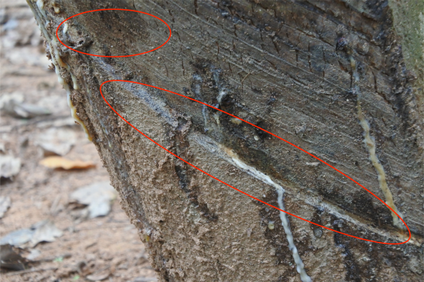 割面條潰瘍病主要危害割面,每年3-12月均可發(fā)生,發(fā)病初期在橡膠樹割面新割線上出現(xiàn)一條至數(shù)條排列成柵欄狀的豎立黑線,深達(dá)木質(zhì)部。黑線繼續(xù)擴(kuò)展成病斑或塊斑,天氣潮濕時(shí),病斑表面長(zhǎng)出白色霉?fàn)钗?。皮下溢膠可導(dǎo)致皮層爆裂、隆起,木質(zhì)部變黑褐色。