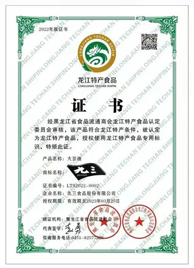 根據(jù)專(zhuān)家審定,“九三”大豆油符合龍江特產(chǎn)食品復(fù)審標(biāo)準(zhǔn),省食品流通商會(huì)龍江特產(chǎn)食品認(rèn)定委員會(huì)決定,為九三糧油工業(yè)集團(tuán)有限公司頒發(fā)標(biāo)識(shí)牌和“龍江特產(chǎn)食品”專(zhuān)用標(biāo)識(shí)許可使用證書(shū)。
