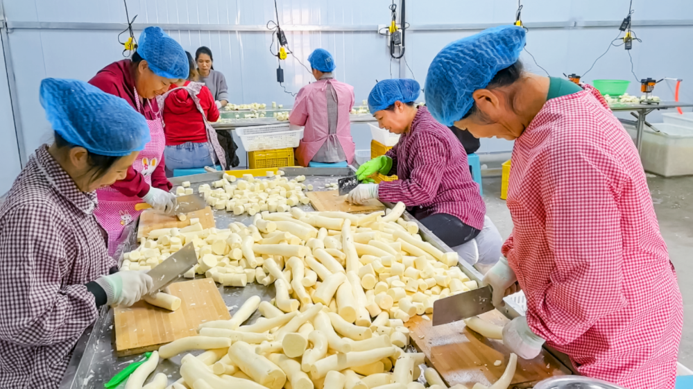 位于20公里外的木薯加工廠同樣熱鬧,滿載新鮮木薯的貨車駛?cè)牒螅と藗冄杆俜謷?、去皮、切塊去芯,經(jīng)真空包裝后送入冷庫(kù)待發(fā)。