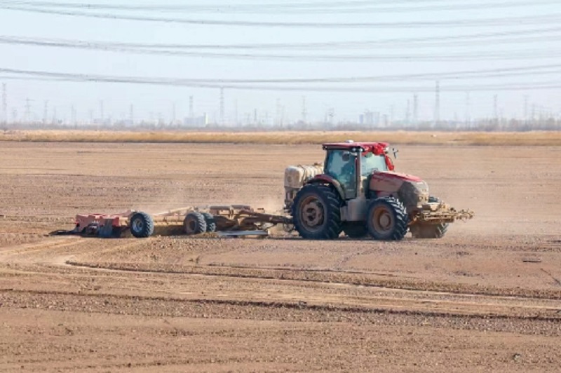 圖為寧夏農(nóng)墾前進(jìn)農(nóng)場(chǎng)正在開(kāi)展聯(lián)合整地作業(yè)?!£惓俊z