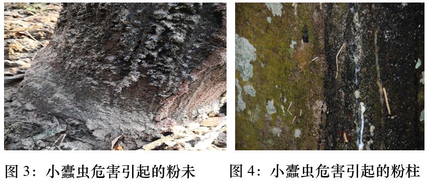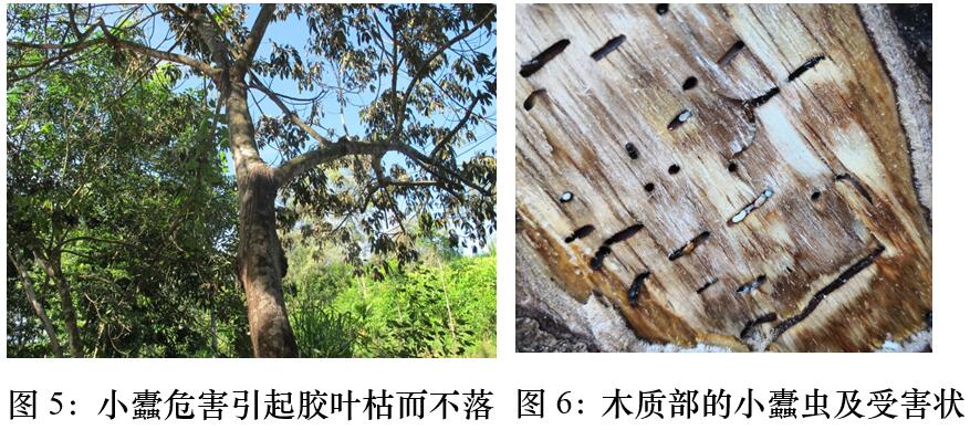 小蠹蟲(chóng)危害后,其受害部位顯現(xiàn)流膠、針錐狀蛀孔、黃褐色木質(zhì)粉末,嚴(yán)重時(shí)莖干遍布蛀孔和粉柱、粉末等癥狀。鑒于寒害也會(huì)出現(xiàn)膠樹(shù)流膠,需注意區(qū)分寒害流膠與蟲(chóng)害流膠。小蠹蟲(chóng)危害的流膠部位主要分布于膠樹(shù)樹(shù)干開(kāi)割部位及其上下30—50厘米范圍內(nèi),嚴(yán)重時(shí)才會(huì)分布在膠樹(shù)其他位置或者未開(kāi)割膠樹(shù),將膠線拉開(kāi),可看到小蠹蟲(chóng)造成的圓形蛀孔,如果是新蛀的,則可看到水漬狀的圓形蛀點(diǎn);寒害流膠的部位可分布于膠樹(shù)樹(shù)干任意位置,甚至是樹(shù)枝上,將膠線拉開(kāi),可以明顯看出流膠部位出現(xiàn)細(xì)小的裂縫或爆皮。