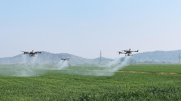 壽西湖農(nóng)場搶在小麥抽穗八成至齊穗揚花期啟動首輪 “一噴三防”工作,組織100多臺套植保無人機和自走式植保機協(xié)同作業(yè)。(董 云)
