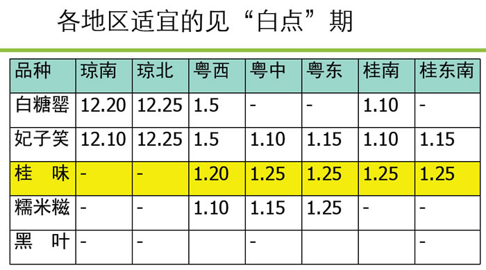 原因分析:秋冬季日照時(shí)間長、光照充足、天氣溫暖,是荔枝光合積累的黃金時(shí)期。貯藏碳水化合物除滿足成花需求之外,也供給開花和初期坐果之需。荔枝在葉片轉(zhuǎn)綠之后才能進(jìn)入凈光合狀態(tài)。以見 “白點(diǎn)”時(shí)間為節(jié)點(diǎn),秋梢老熟時(shí)間越長,凈光合積累時(shí)間越長,積累和貯藏碳水化合物量越多。