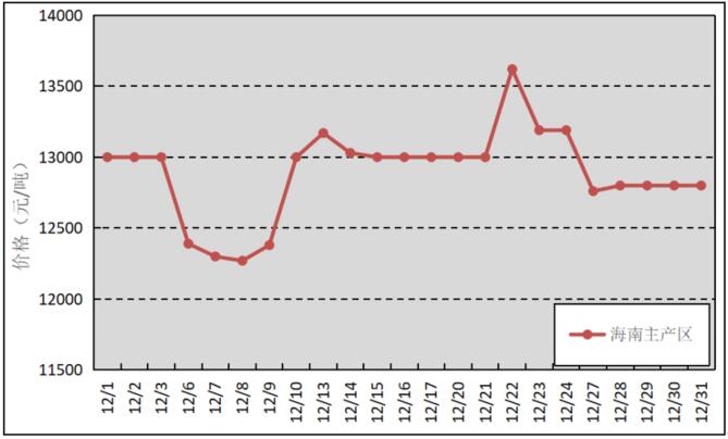 國(guó)內(nèi)主產(chǎn)區(qū):12月,云南產(chǎn)區(qū)基本停割,海南割膠也進(jìn)入尾聲,原料供應(yīng)減少。原料膠(折干膠)月均價(jià)格為12891元/噸,環(huán)比下降27元/噸。