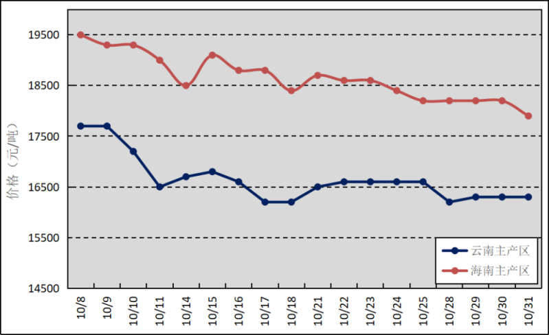 國內(nèi)主產(chǎn)區(qū):10月,除云南部分產(chǎn)區(qū)因季風(fēng)性落葉病暴發(fā)、海南部分產(chǎn)區(qū)受下旬降水擾動明顯增多影響割膠作業(yè)外,國內(nèi)大部分產(chǎn)區(qū)割膠工作正常開展,膠乳產(chǎn)量逐步增加。云南、海南鮮膠乳(折干膠)月均價格分別為16644元/噸、18650元/噸,環(huán)比上漲901元/噸、2845元/噸。