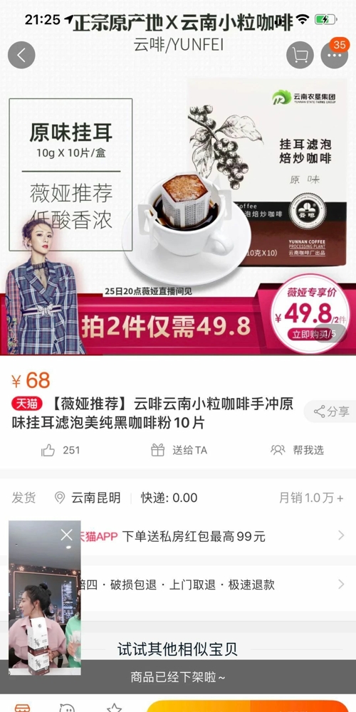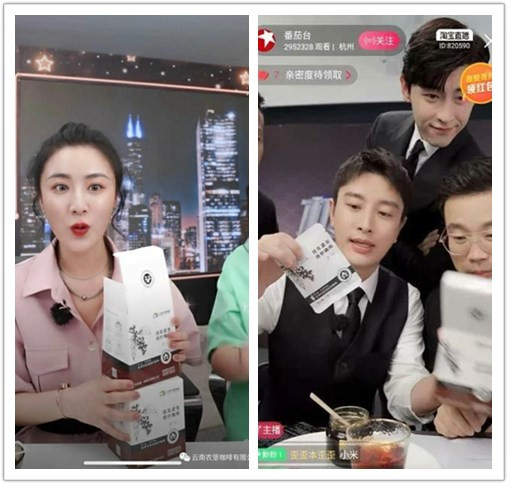 2020年4月25日,云南農墾咖啡有限公司攜手淘寶好物推薦官薇婭女士,開展了“云啡”咖啡產品2020年度第一次直播。此次直播約2000多萬人觀看,張嘉倪、岳云鵬、宋小寶、賈乃亮、王迅及鄧倫等影視明星嘉賓助力直播,為云南農墾咖啡有限公司掛耳咖啡做產品介紹及推廣,5秒實現3噸咖啡的驚人銷量,刷新了2019年單次直播3秒銷售1.3噸的佳績。