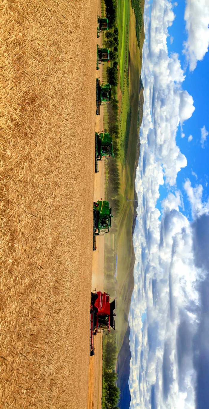 《田疇“畫”豐收》 內(nèi)蒙古興安農(nóng)墾索倫牧場規(guī)模化經(jīng)營管理區(qū)小麥?zhǔn)崭钭鳂I(yè)。王福財(cái) 攝