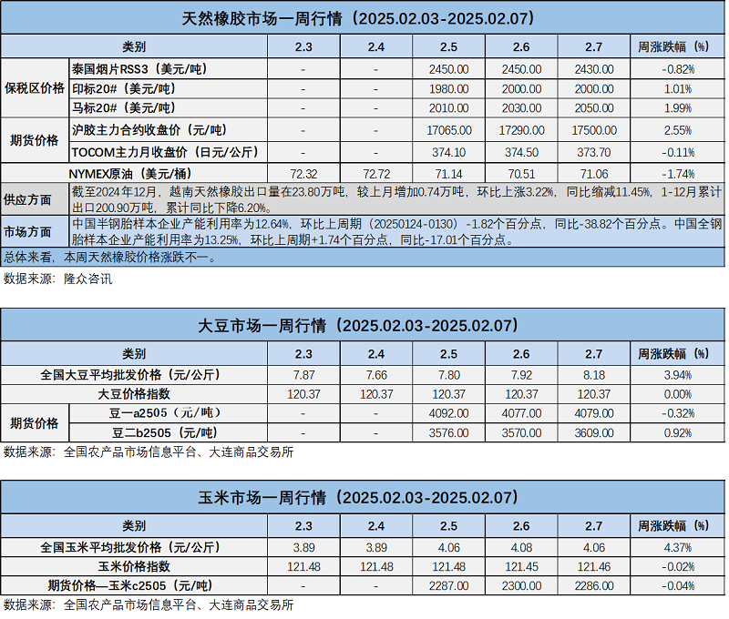 天然橡膠、大豆、玉米市場一周行情(2025.02.03-02.07)