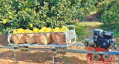 柚子下山坐“快軌”?!耙郧斑\(yùn)柚子,要靠肩挑背扛,辛苦不說,費(fèi)時(shí)費(fèi)工,現(xiàn)在果園里安裝了單軌山地果園運(yùn)輸機(jī),效率翻了好幾倍?!毖阊箧?zhèn)南福村柚農(nóng)黃裕亮輕點(diǎn)按鈕,載著700多斤柚子的運(yùn)輸機(jī)穩(wěn)穩(wěn)啟動(dòng),沿著軌道往前奔去?!斑\(yùn)700多斤柚子,以往要8個(gè)人背,半個(gè)多小時(shí)才能到山下。用運(yùn)輸機(jī)的話,只要10分鐘?!秉S裕亮感嘆。