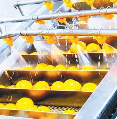 在浙江艾佳果蔬開發(fā)有限責(zé)任公司,胡柚正在生產(chǎn)線上進(jìn)行清洗。