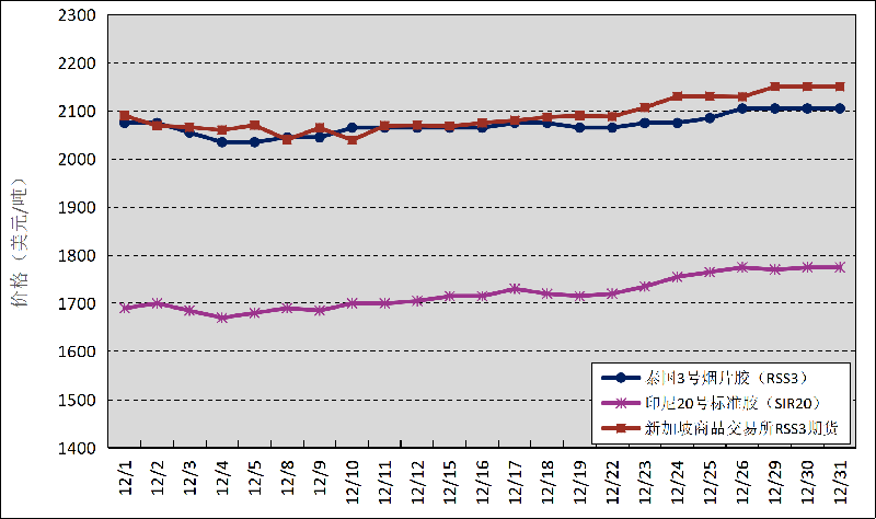 國外主產(chǎn)區(qū):12月,泰國3號煙片膠(RSS3)平均價格2071美元/噸,環(huán)比上漲23美元/噸,最高價2105美元/噸,最低價2035美元/噸;印尼20號標準膠(SIR20)平均價格1720美元/噸,環(huán)比上漲38美元/噸,最高價1775美元/噸,最低價1670美元/噸;新加坡商品交易所RSS3期貨主力合約月均結(jié)算價格2090美元/噸,環(huán)比上漲43美元/噸,最高價2150美元/噸,最低價2039美元/噸。