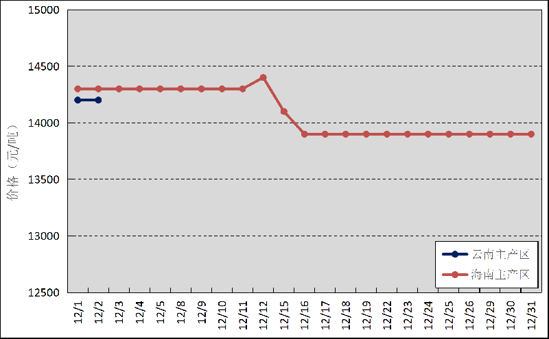 國內(nèi)主產(chǎn)區(qū):12月,云南產(chǎn)區(qū)全面停割,海南產(chǎn)區(qū)逐步停割。云南、海南鮮膠乳(折干膠)月均價格分別為14200元/噸、14087元/噸,分別環(huán)比上漲279元/噸、下跌192元/噸。