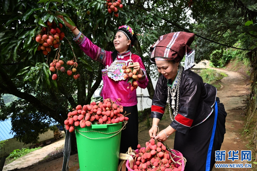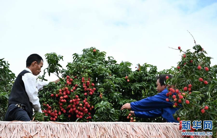 村民采摘荔枝(6月9日攝)。新華網(wǎng)發(fā)(熊平祥攝)