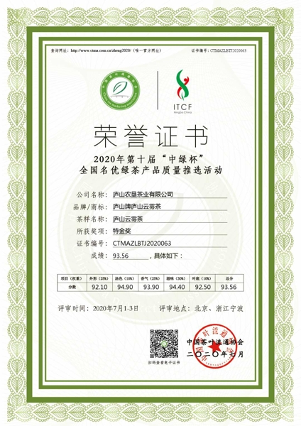 “廬山牌”廬山云霧茶1982年榮獲江西省優(yōu)質(zhì)產(chǎn)品稱號;1983年又被評為部優(yōu);1985年榮獲國家優(yōu)質(zhì)產(chǎn)品銀質(zhì)獎,且在1990年、1996年兩次復(fù)評中保持了這一榮譽(yù)稱號;1988年獲首屆中國食品博覽會金獎;2005年至2007年連續(xù)二屆獲得北京國際茶博會金獎;2020年獲得第十屆“中綠杯”名優(yōu)綠茶產(chǎn)品質(zhì)量特金獎。