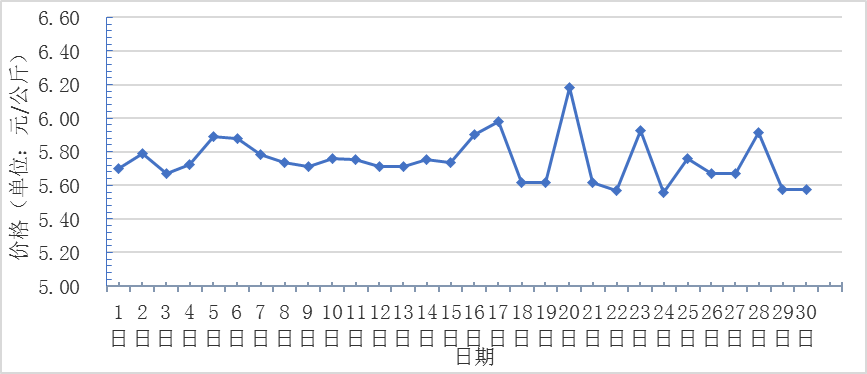 6月,全國(guó)重點(diǎn)監(jiān)測(cè)農(nóng)產(chǎn)品批發(fā)市場(chǎng)香蕉總交易量達(dá)2.2萬噸,同比下降4.3%,環(huán)比下降15.4%;總交易價(jià)值11480.5萬元,同比下降25.2%,環(huán)比下降12.4%。日平均價(jià)格最高為6.2元/千克,最低為5.6元/千克,全月平均價(jià)格為 5.8元/千克,同比下降13.4%,環(huán)比上漲11.5%(每日價(jià)格變化如圖)。