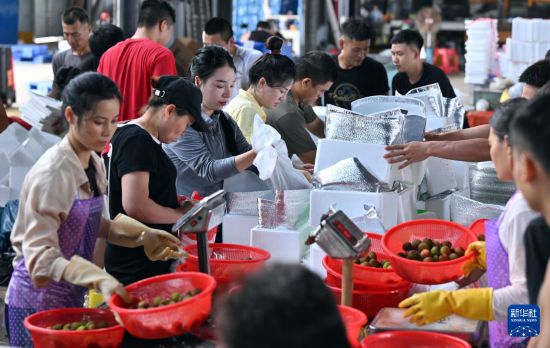 5月22日,工人在位于??诘暮D霞t明農(nóng)產(chǎn)品(荔枝)交易中心打包荔枝。