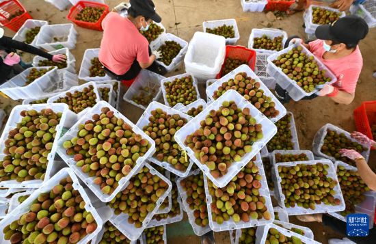 5月22日,工人在??谑协偵絽^(qū)三門坡鎮(zhèn)的荔枝收購(gòu)點(diǎn)打包荔枝。