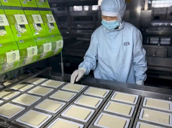 在北京,最知名的豆腐品牌當(dāng)屬“白玉”。北京白玉食品有限公司每天可生產(chǎn)近30萬盒的盒裝豆腐,北京市場商超系統(tǒng)覆蓋率達(dá)90%,并實(shí)現(xiàn)對北京各大農(nóng)貿(mào)市場的全覆蓋。從泡豆、磨漿、煮漿、點(diǎn)腦、壓制到成型,21道自動(dòng)化工序都遵循傳統(tǒng)技藝,展現(xiàn)了“白玉”的初心與追求。