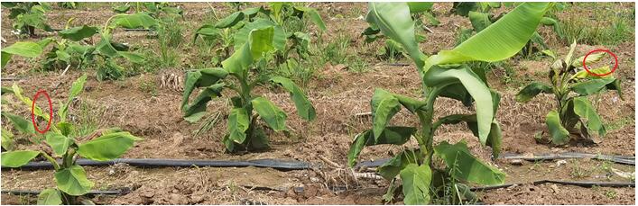三、及時(shí)清理蕉園。發(fā)現(xiàn)病株必須挖出病蕉,帶出田外深埋漚制,同時(shí)進(jìn)行土壤消毒。
