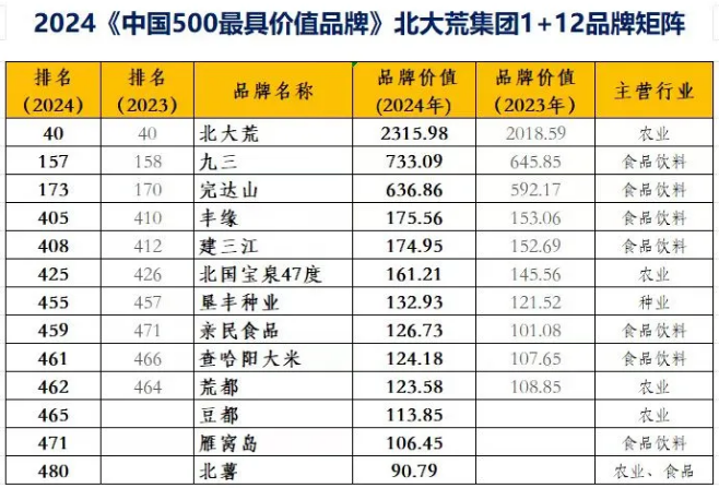 在這份基于財(cái)務(wù)數(shù)據(jù)、品牌強(qiáng)度和消費(fèi)者行為分析的年度報(bào)告中,由九三糧油工業(yè)集團(tuán)有限公司持有的“九三”品牌,品牌價(jià)值達(dá)733.09億元,排名第157位,較去年增長(zhǎng)87.24億元。由北大荒完達(dá)山乳業(yè)股份有限公司持有的“完達(dá)山”品牌,品牌價(jià)值達(dá)636.86億元,排名第173位,較去年增長(zhǎng)44.69億元。由北大荒豐緣集團(tuán)有限公司持有的“豐緣”品牌,品牌價(jià)值達(dá)175.56億元,排名第405位。由建三江分公司持有的“建三江”品牌,品牌價(jià)值達(dá)174.95億元,排名第408位。由寶泉嶺分公司持有的“北國(guó)寶泉47度”品牌,品牌價(jià)值達(dá)161.21億元,排名第425位。由北大荒墾豐種業(yè)股份有限公司持有的“墾豐種業(yè)”品牌,品牌價(jià)值達(dá)132.93億元,排名第455位。由北大荒親民有機(jī)食品有限公司持有的“親民食品”品牌,品牌價(jià)值達(dá)126.73億元,排名第459位。由黑龍江查哈陽(yáng)米業(yè)有限公司持有的“查哈陽(yáng)大米”品牌,品牌價(jià)值達(dá)124.18億元,排名第461位。由牡丹江分公司持有的“荒都”品牌,品牌價(jià)值達(dá)123.58億元,排名第462位。由九三分公司持有的“豆都”品牌,品牌價(jià)值達(dá)113.85億元,排名第465位。由紅興隆分公司持有的“雁窩島”品牌,品牌價(jià)值達(dá)106.45億元,排名第471位。由北大荒薯業(yè)集團(tuán)有限公司持有的“北薯”品牌,品牌價(jià)值達(dá)90.79億元,排名第480位。