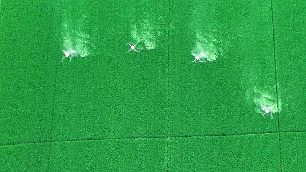 東風(fēng)湖農(nóng)場(chǎng)采取植保無人機(jī)編隊(duì)協(xié)同作業(yè)的方式,精準(zhǔn)高效噴施混合藥劑,全面推進(jìn)“一噴三防”工作。(高 原)