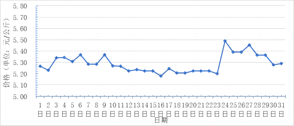3月,全國重點(diǎn)監(jiān)測(cè)農(nóng)產(chǎn)品批發(fā)市場(chǎng)香蕉總交易量達(dá)2.7萬噸,同比下降3.6%,環(huán)比增長(zhǎng)42.1%;總交易價(jià)值14303.7萬元,同比下降27.7%,環(huán)比增長(zhǎng)43.48%。日平均價(jià)格最高為5.5元/千克,最低為5.2元/千克,全月平均價(jià)格為5.3元/千克,同比下降17.2%,環(huán)比基本持平(每日價(jià)格變化如圖)。