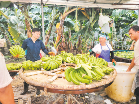 香蕉種植基地里,工人忙著清洗新采摘的香蕉。