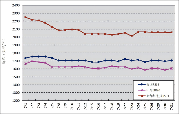 國外主產(chǎn)區(qū):7月,泰國RSS3平均價格為1712美元/噸,環(huán)比下跌672美元/噸,最高價為1755美元/噸,最低價為1685美元/噸;印尼SIR20平均價格為1625美元/噸,環(huán)比下跌98美元/噸,最高價為1695美元/噸,最低價為1585美元/噸;新加坡RSS3期貨主力合約月均結算價格為2087美元/噸,環(huán)比下跌226美元/噸,最高價為2249美元/噸,最低價為2011美元/噸。