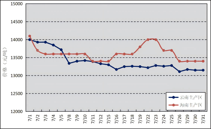 國內主產(chǎn)區(qū):7月,國內除部分產(chǎn)區(qū)受階段性降雨影響外,總體上天氣利于割膠生產(chǎn),膠乳供應全面上量,原料收購價格逐步回落。云南、海南鮮膠乳(折干膠)月均價格分別為13398元/噸、13617元/噸,環(huán)比下跌976元/噸、1525元/噸。