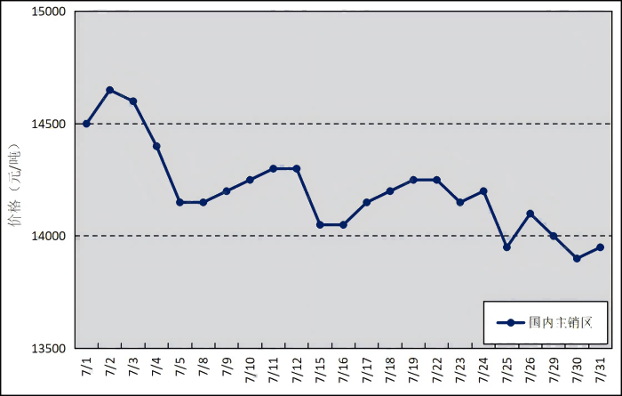 國內主銷區(qū):7月,上海、青島和天津等銷區(qū)市場的國產(chǎn)全乳標準膠平均價格為14204元/噸,環(huán)比下跌441元/噸,最高價為14650元/噸,最低價為13900元/噸。