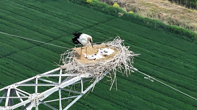 在濱淮農(nóng)場養(yǎng)殖中心旁的兩座電力鐵塔上,由枯枝搭建的巨型鳥巢格外醒目。被譽(yù)為“鳥界大熊貓”的國家一級重點(diǎn)保護(hù)野生動物東方白鸛,已連續(xù)多年在此筑巢繁衍,今年更是有兩窩共8只幼鳥破殼而出,正健康成長,成為春日濱淮農(nóng)場一道靈動的生態(tài)風(fēng)景線。