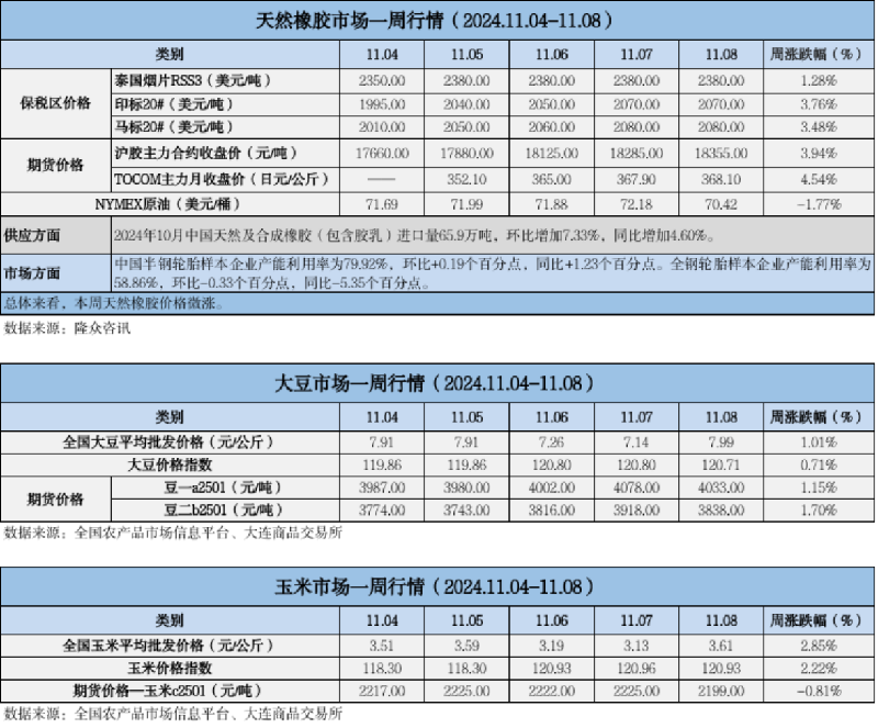 天然橡膠、大豆、玉米市場(chǎng)一周行情(2024.11.04-11.08)