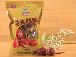 天山嬌干棗,原料多來自哈密大棗。哈密大棗是中國紅棗家族中一個相對獨(dú)立的優(yōu)良品種,是在新疆哈密由南平原戈壁特定氣候條件下經(jīng)長期馴化生成的果中珍品。古代謂之“香棗”,一直是獻(xiàn)給朝廷的上乘西域貢品。據(jù)史料考證,哈密栽培大棗已有兩千年的歷史,以其個大、皮薄、核小、肉厚、顏色好、含糖量高、干而不皺等優(yōu)點,在國內(nèi)外市場上馳名。