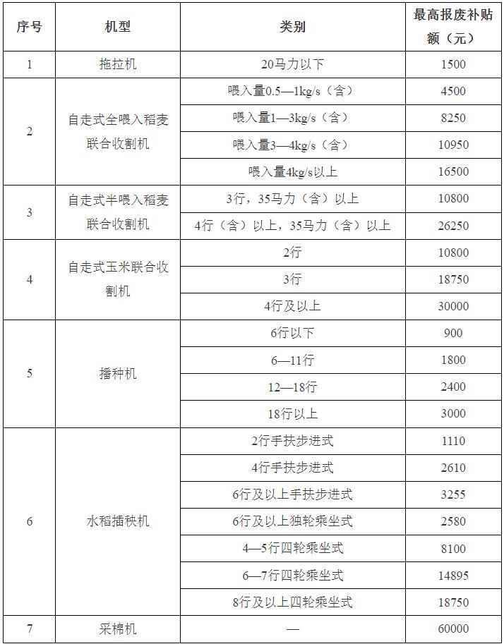 報(bào)廢20馬力以下拖拉機(jī),單臺(tái)最高報(bào)廢補(bǔ)貼額由1000元提高到1500元;報(bào)廢聯(lián)合收割機(jī)、水稻插秧機(jī)、播種機(jī)并新購(gòu)置同種類機(jī)具,按不超過50%提高報(bào)廢補(bǔ)貼標(biāo)準(zhǔn),單臺(tái)最高報(bào)廢補(bǔ)貼額不超過3萬(wàn)元;報(bào)廢并更新購(gòu)置采棉機(jī),單臺(tái)最高報(bào)廢補(bǔ)貼額由3萬(wàn)元提高到6萬(wàn)元(詳見附件)。除20馬力以下拖拉機(jī)外,對(duì)只申請(qǐng)報(bào)廢不新購(gòu)置的,繼續(xù)執(zhí)行《通知》規(guī)定的報(bào)廢補(bǔ)貼標(biāo)準(zhǔn)。對(duì)自《通知》印發(fā)之日起提交報(bào)廢補(bǔ)貼申請(qǐng)的,按調(diào)整后的報(bào)廢補(bǔ)貼標(biāo)準(zhǔn)執(zhí)行,對(duì)已領(lǐng)取報(bào)廢補(bǔ)貼的,補(bǔ)齊差額部分補(bǔ)貼。