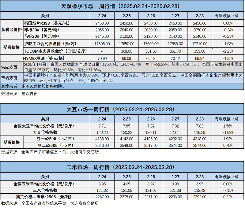 天然橡膠、大豆、玉米市場(chǎng)一周行情(2025.02.24-02.28)