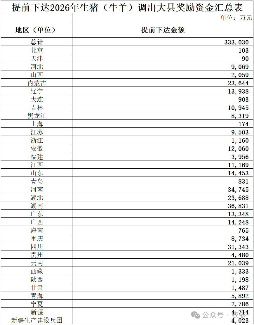 附件:提前下達(dá)2026年生豬(牛羊)調(diào)出大縣獎勵資金匯總表