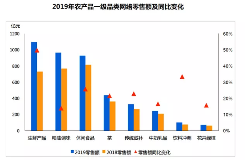 近日,在農(nóng)業(yè)農(nóng)村部市場與信息化司的指導(dǎo)與支持下,中國農(nóng)業(yè)科學(xué)院農(nóng)業(yè)信息研究所發(fā)布《中國農(nóng)產(chǎn)品網(wǎng)絡(luò)零售市場暨重點單品分析報告》(以下簡稱《報告》)。報告針對全國農(nóng)產(chǎn)品網(wǎng)絡(luò)零售市場進(jìn)行分析,其中2019年生鮮產(chǎn)品網(wǎng)絡(luò)零售額突破1094.9億元,成為農(nóng)產(chǎn)品上行第一大品類,網(wǎng)絡(luò)零售量同比增加78.4%。
